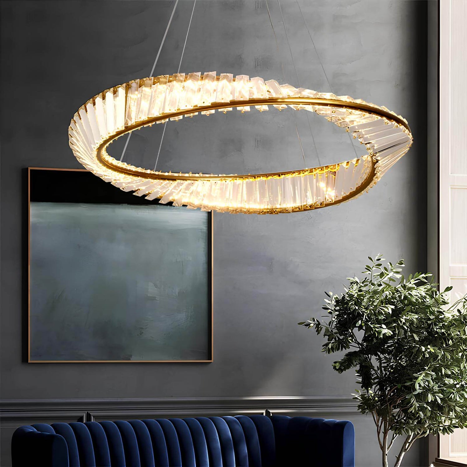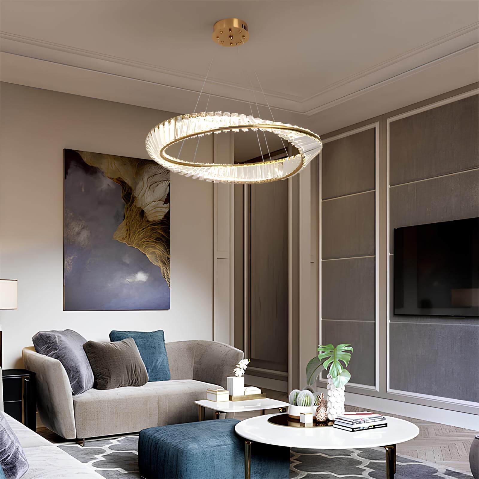 Avec son anneau doré habillé de cristaux taillés, cette suspension LED apporte éclat et modernité à vos pièces. Idéale pour un salon, une salle à manger ou une chambre, elle diffuse une lumière élégante et chaleureuse.
