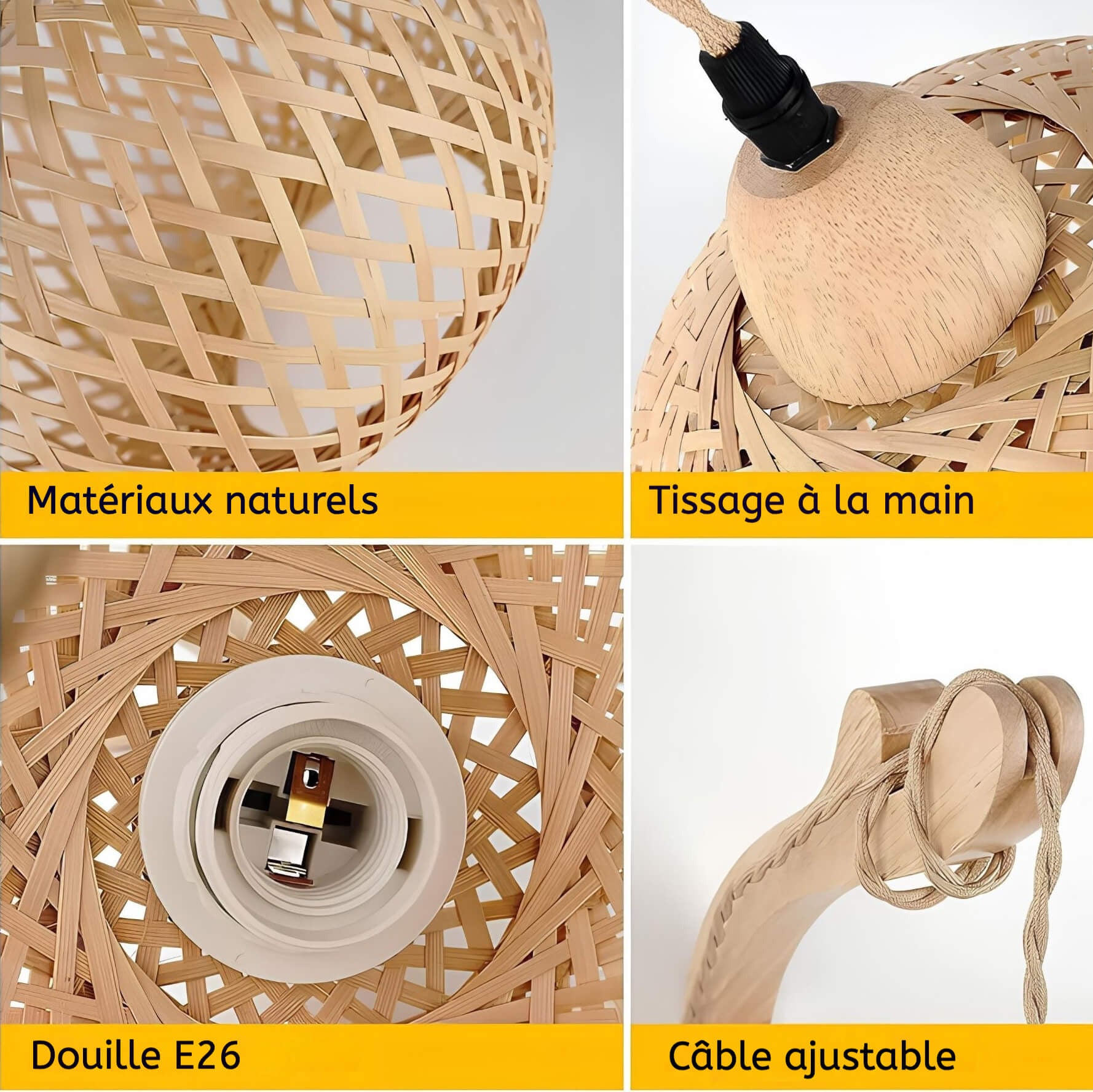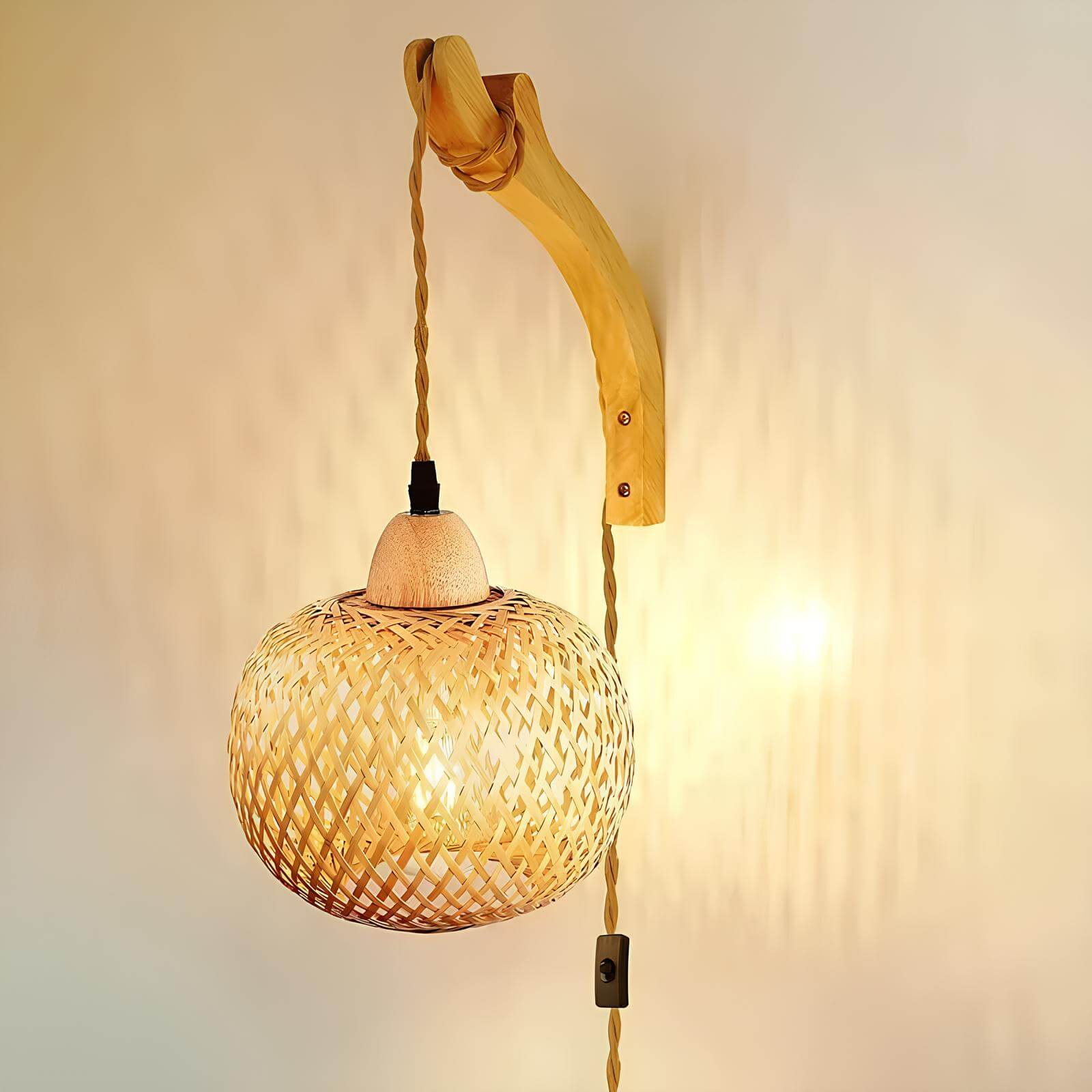Cette suspension murale en bambou tressé diffuse des reflets chaleureux qui rappellent la lueur d’une lanterne au crépuscule.