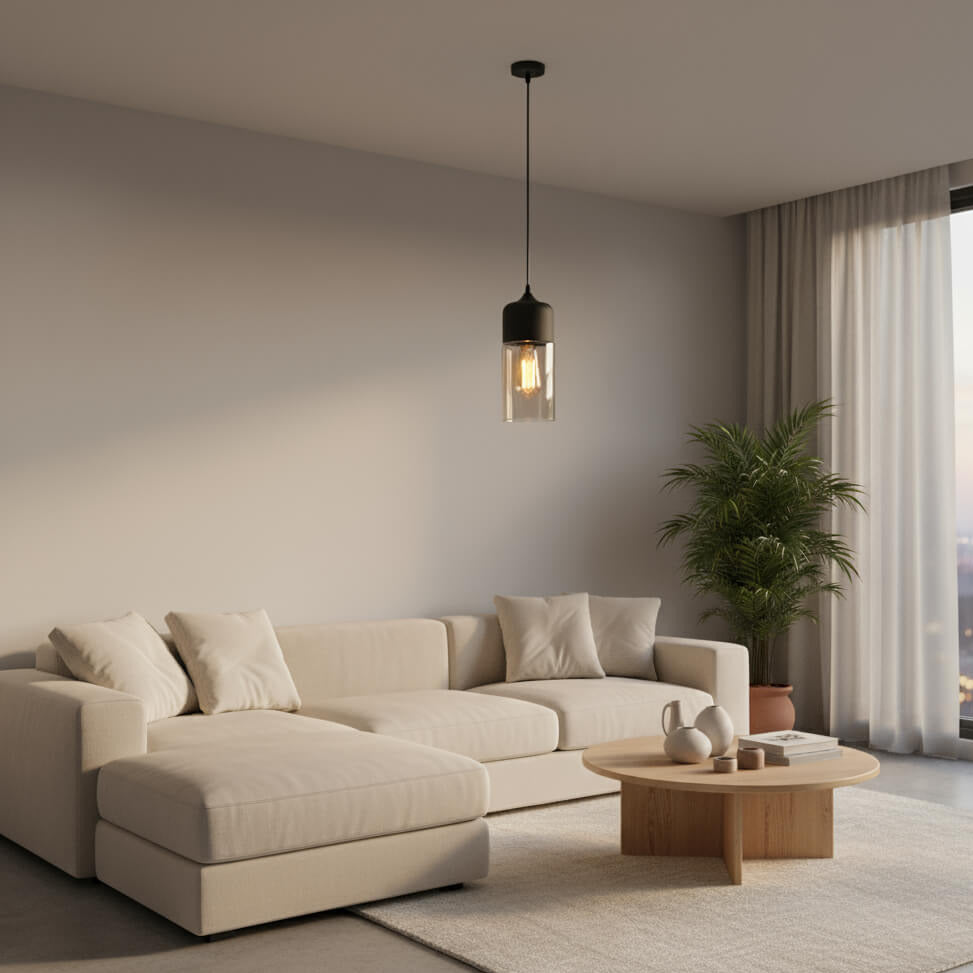Élégante et minimaliste, cette suspension en verre cylindrique et métal noir diffuse une lumière douce et chaleureuse. Idéale dans un salon, une salle à manger ou une cuisine, elle s’adapte à tous les intérieurs modernes.