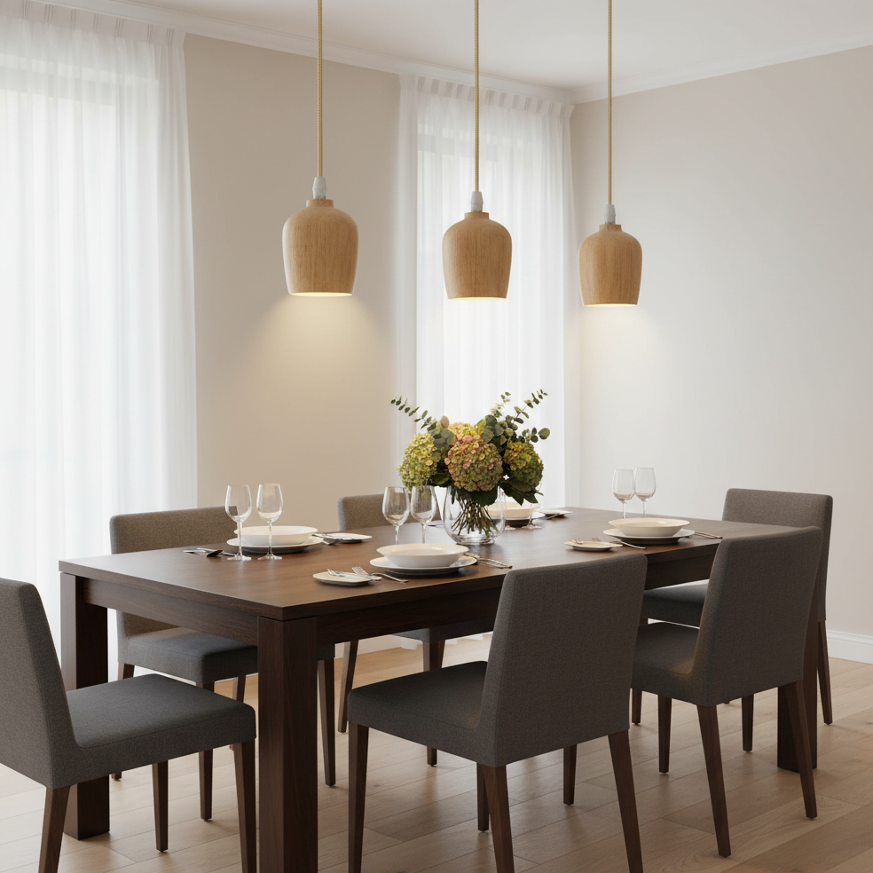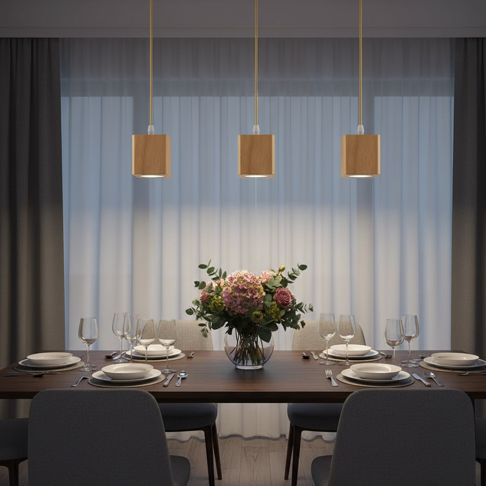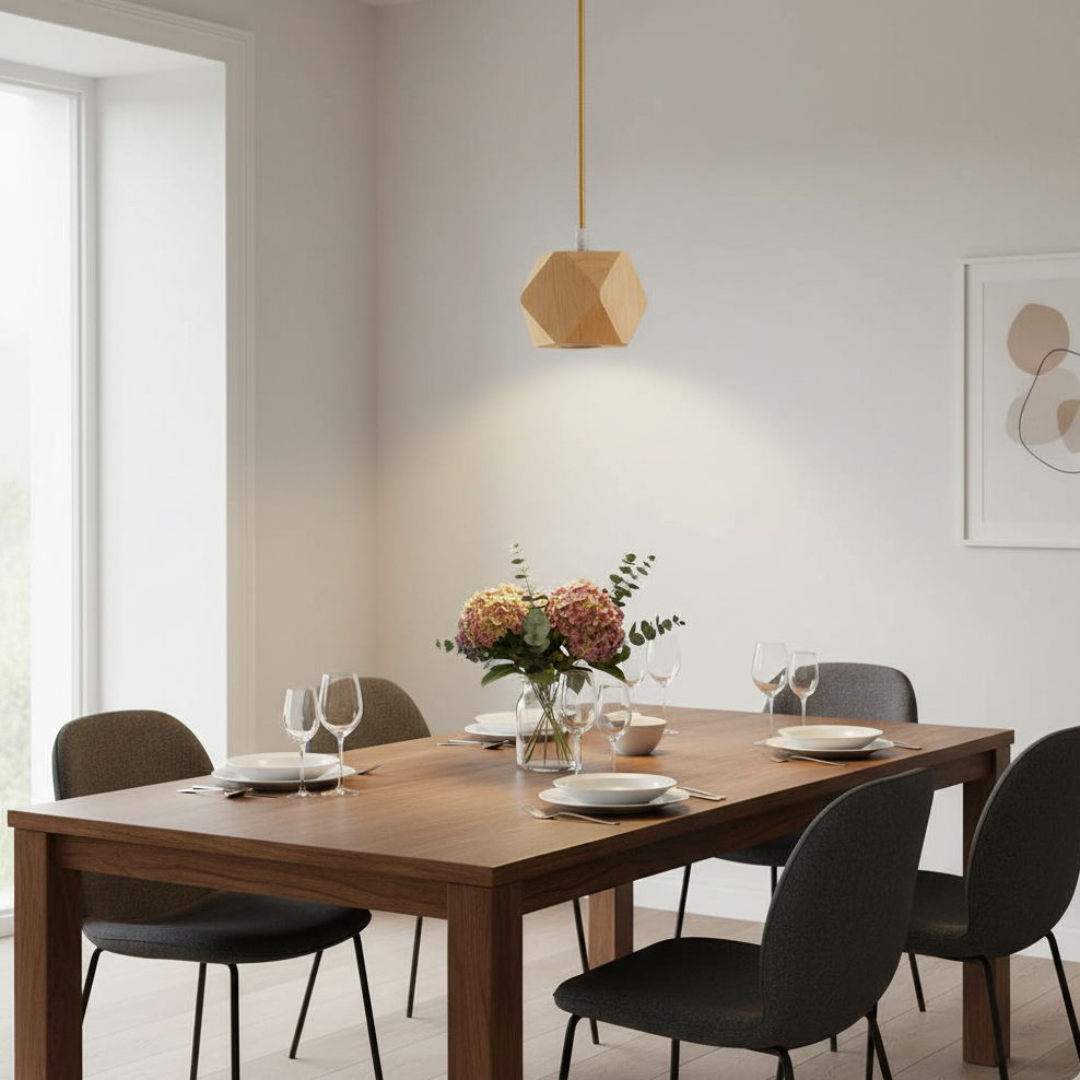 Cette suspension en bois massif combine design épuré et fonctionnalité.