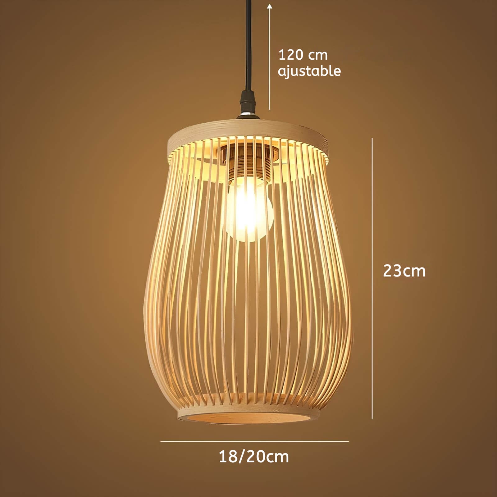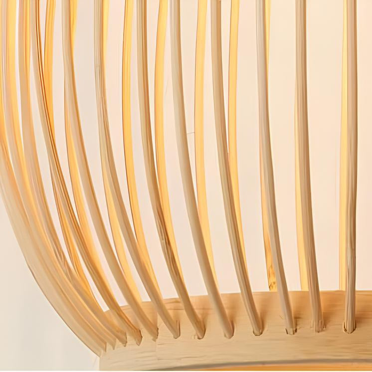 Sous son abat-jour en bambou finement tressé, cette suspension diffuse une lumière douce et accueillante.