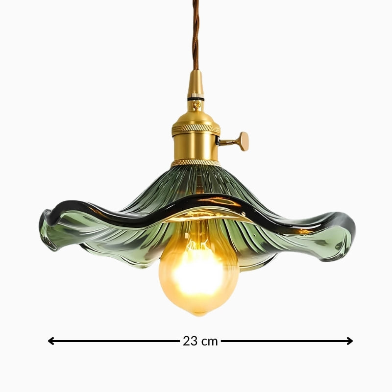 Épurée et élégante, cette suspension en verre et cuivre incarne l’équilibre parfait entre modernité et chaleur. Le verre coloré, disponible en blanc, vert ou ambré, diffuse une lumière douce et agréable qui habille la pièce sans l’alourdir.