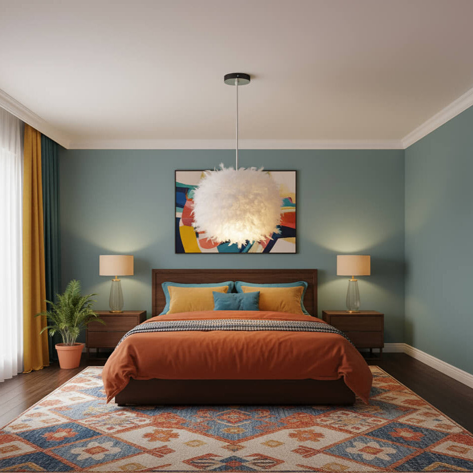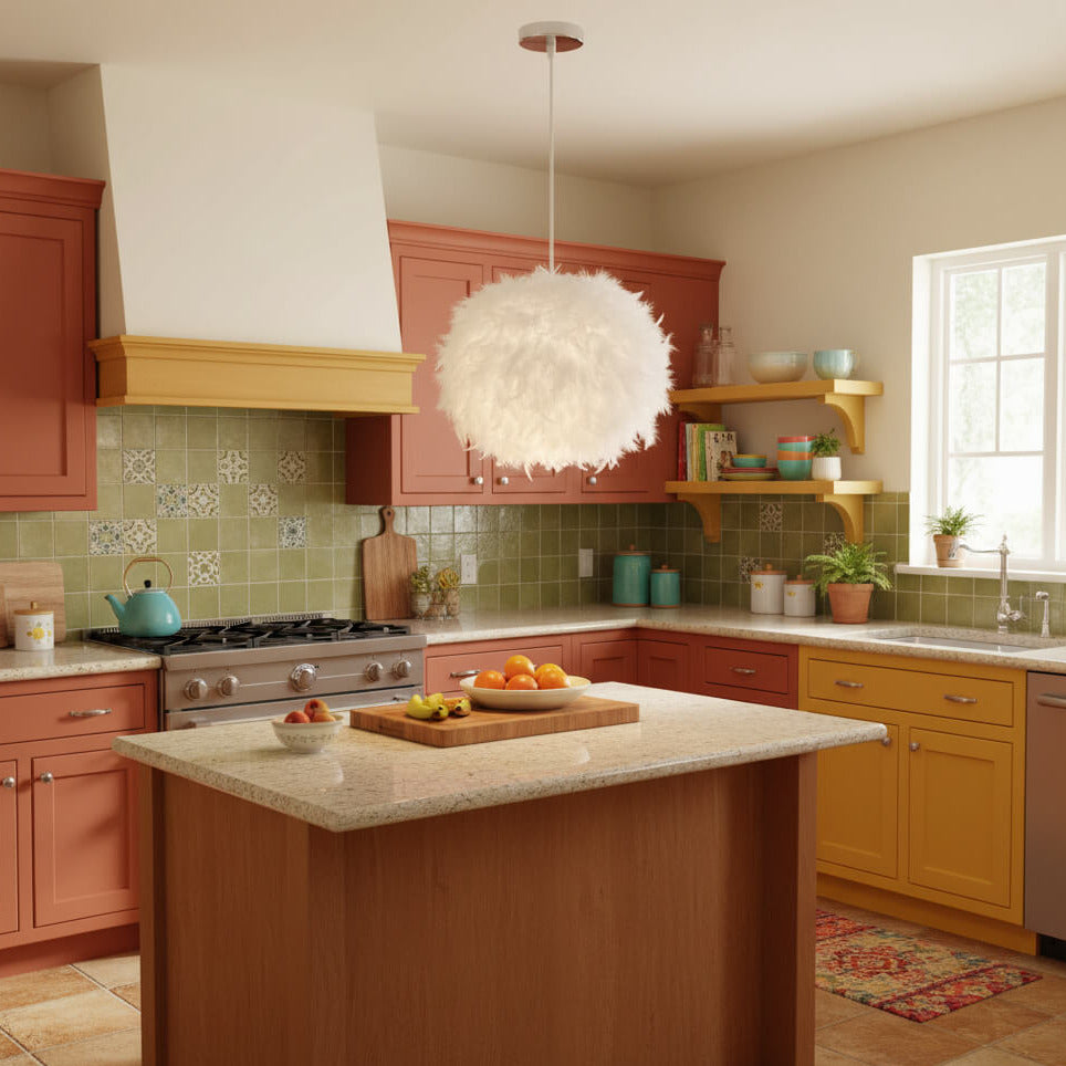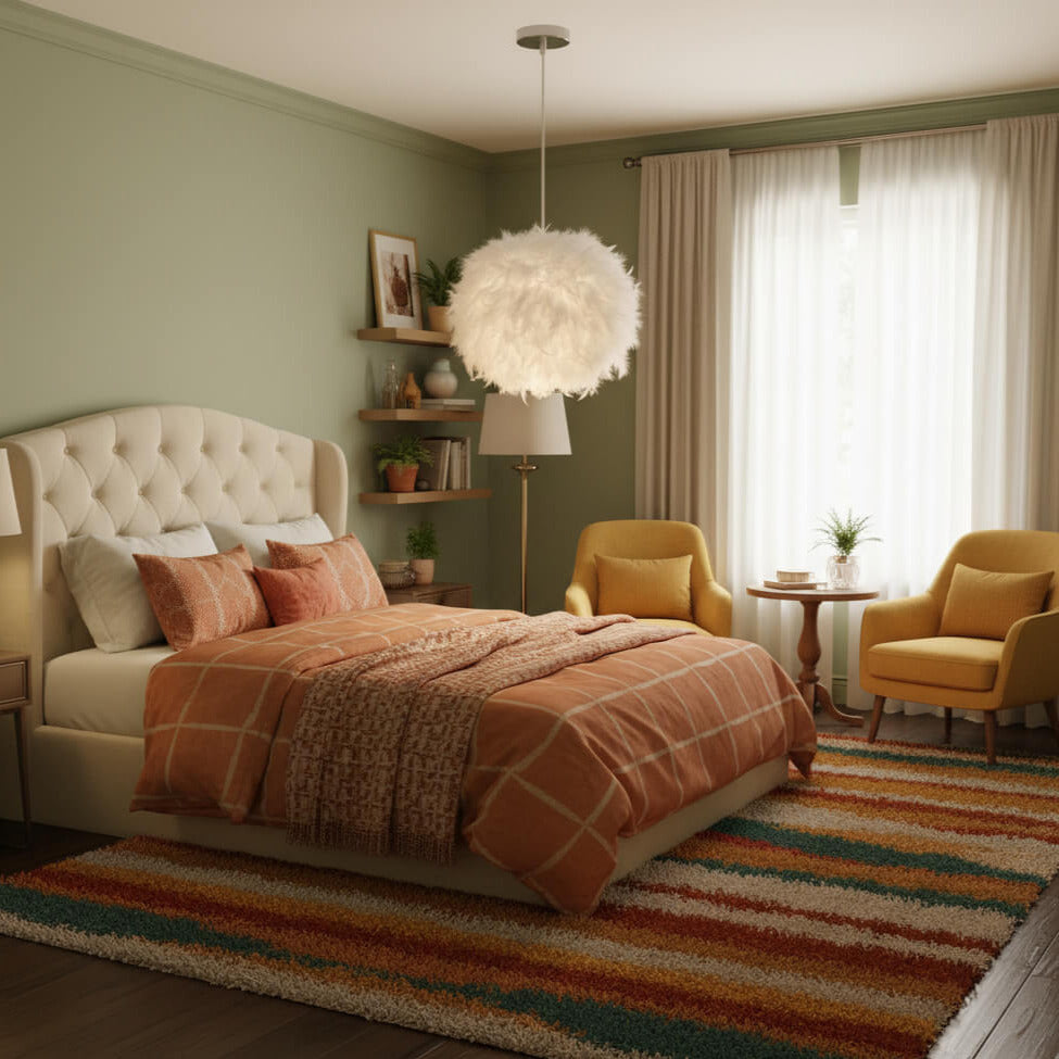 Avec son abat-jour en plumes délicates, cette suspension crée une atmosphère douce et apaisante. Dans une chambre, elle favorise la détente et le repos.